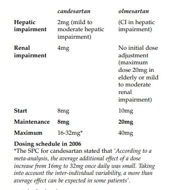 - If further blood pressure reduction was required then the dose might be increased to the maximum doses of candesartan (32mg) and olmesartan (40mg).