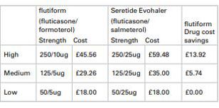 The cost comparison table only compared Flutiform to Evohaler. GlaxoSmithKline noted that alternative maintenance therapies were available at Step 3 and 4 of the BTS/SIGN guidelines. Furthermore, theomission by Napp of the Seretide Accuhaler prices, particularly the high strength, appeared deliberate to conceal the fact that the Seretide 500 Accuhaler was less expensive than Flutiform 250/10mcg. In inter-company dialogue, Napp submitted that the Seretide Evohaler was the most appropriate comparator because clinical data vs Seretide Evohaler had been presented within leavepiece 1. GlaxoSmithKline disagreed with Napp's position and noted that the appropriate information referenced to Bodzenta-Lukaszyk et al, for the mid/ low doses comparisons was missing from the cost comparison table. By so doing, the reader was unaware that the rationale for this cost comparison was based solely upon non-inferior FEV1 results over a 12 week period in adults.