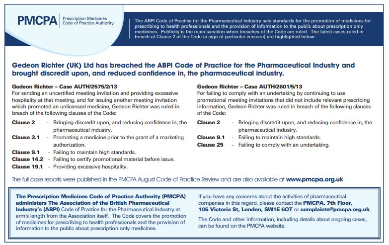 An ex-employee alleged that a meeting invitation, which was available (22 May) on an events company's website, breached the undertaking given by Gedeon Richter (15 April) in Case AUTH/2580/2/13. When the complaint was submitted the complainant's appeal in Case AUTH/2580/2/13 had yet to be heard.