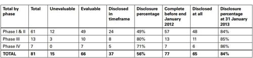 The Panel noted the CMRO publication in that twenty-nine Iressa studies had not been disclosed in the timeframe. The disclosure percentage was 56%. Twelve studies had not been disclosed giving a disclosure percentage at 31 January 2013 for trials completed at 31 January 2012 of 84%. A footnote stated that the majority of Phase II/III trials were completed prior to FDAAA 801 requirements. The remaining undisclosed trials were in the process of publication.