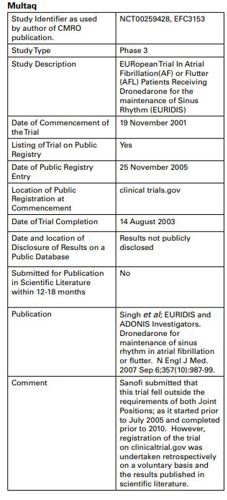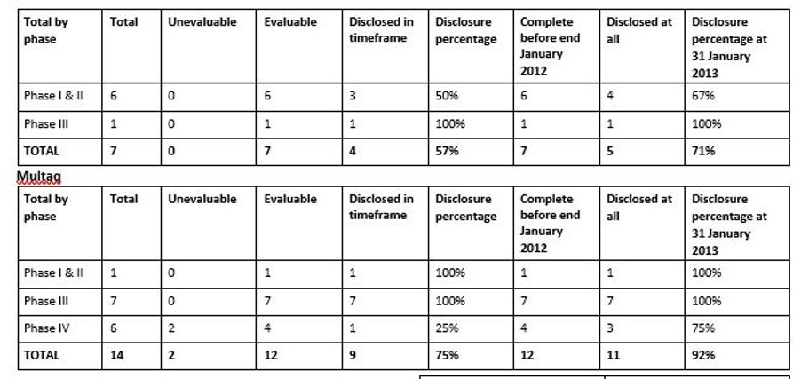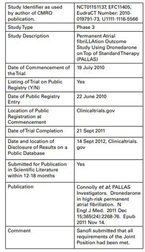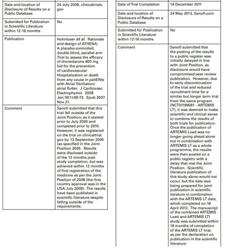 With regard to Multaq, the Panel noted that three of the evaluable trials were not disclosed within the timeframe. The disclosure percentage was 75%. One trial had not been disclosed at all. The disclosure percentage at January 2013 of trials completed by the end of January 2012 was 92%. A footnote stated that the undisclosed trial was in the process of public disclosure preparation at the time of evaluation.