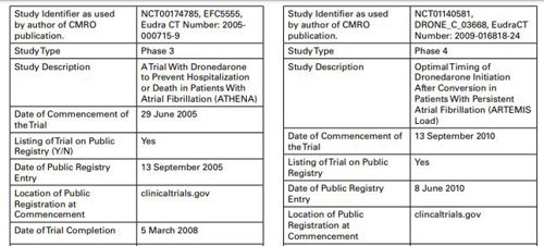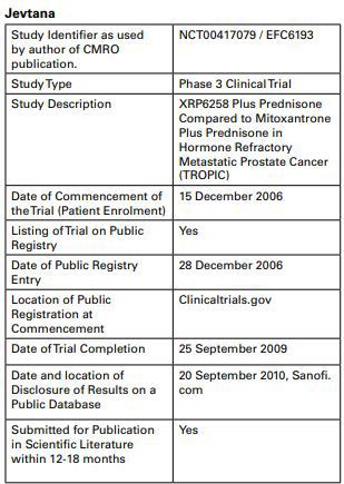 The summary output for each medicine set out the sources for all trials found, irrespective of sponsor and an analysis of publication disclosure in the form of a table which gave details for the studies for Jevtana (cabazitaxel) and Multaq (dronedarone).