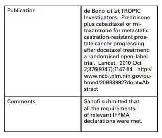 With regard to Jevtana, the Panel noted that three of the evaluable trials were not disclosed within the timeframe. The disclosure percentage was 57%. Two of the trials had not been disclosed at all. The disclosure percentage at 31 January of trials completed by the end of January 2012 was 71%. A footnote stated that four of the undisclosed trials were completed at or before the IFPMA Joint Position of 2005 and FDAAA of 2007.