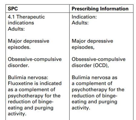 ‘Adults: Major depressive episodes Obsessive-compulsive disorder Bulimia nervosa: Fluoxetine is indicated as a complement to psychotherapy for the reduction of binge-eating and purging activity.